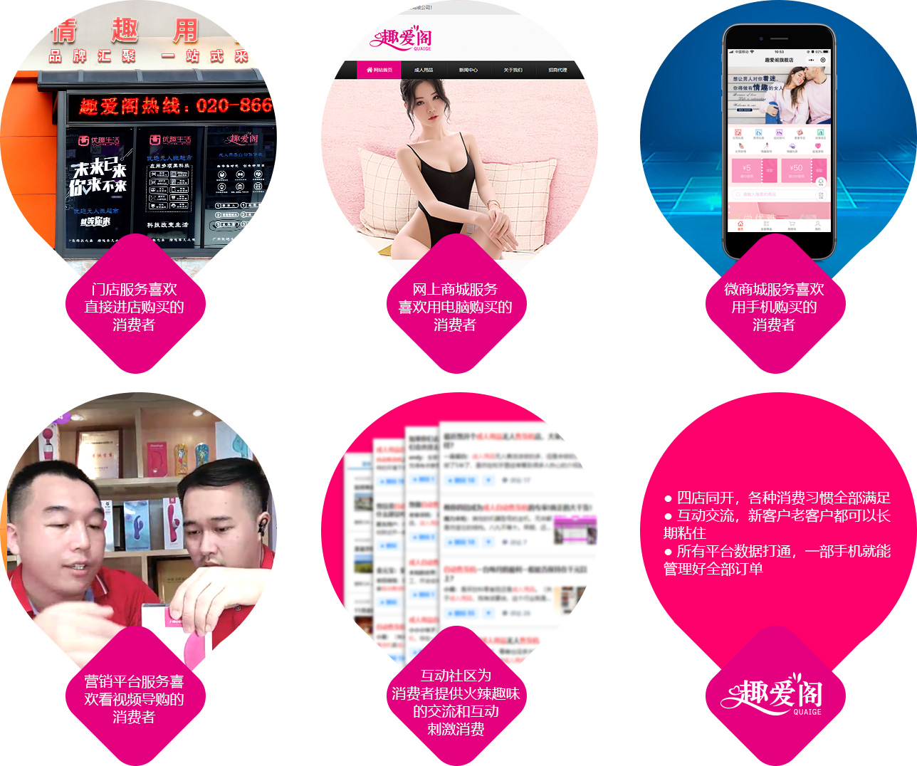 門店、網(wǎng)上商場(chǎng)、微商場(chǎng)、趣愛(ài)閣營(yíng)銷平臺(tái)、趣友互動(dòng)社區(qū),四店同開(kāi),社區(qū)體驗(yàn)交流,滿足各種購(gòu)買需求